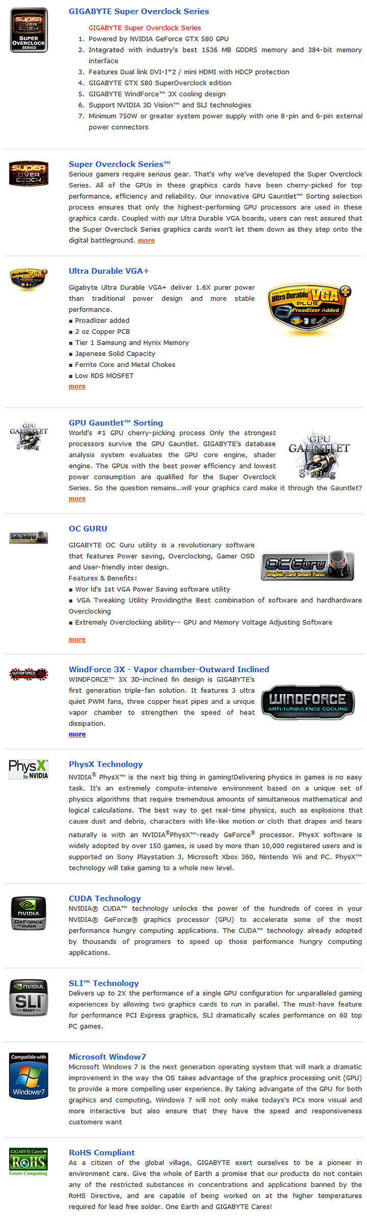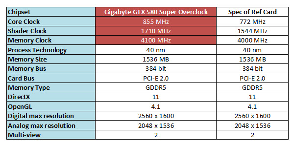 คุณสมบัติหลักต่างๆก็ยังคงเหมือนกับการ์ดจากแบรนด์ Gigabyte ที่เป็นรุ่นพิเศษเช่นเคยครับ โดยที่ความสามารถของการ์ด GIGABYTE GTX 580 Super Overclock เมื่อเทียบกับการ์ด Ref ผมได้ทำการเปรียบเทียบไว้ตามตารางด้านล่าง เพื่อให้เห็นความแตกต่างได้อย่างชัดเจนครับ