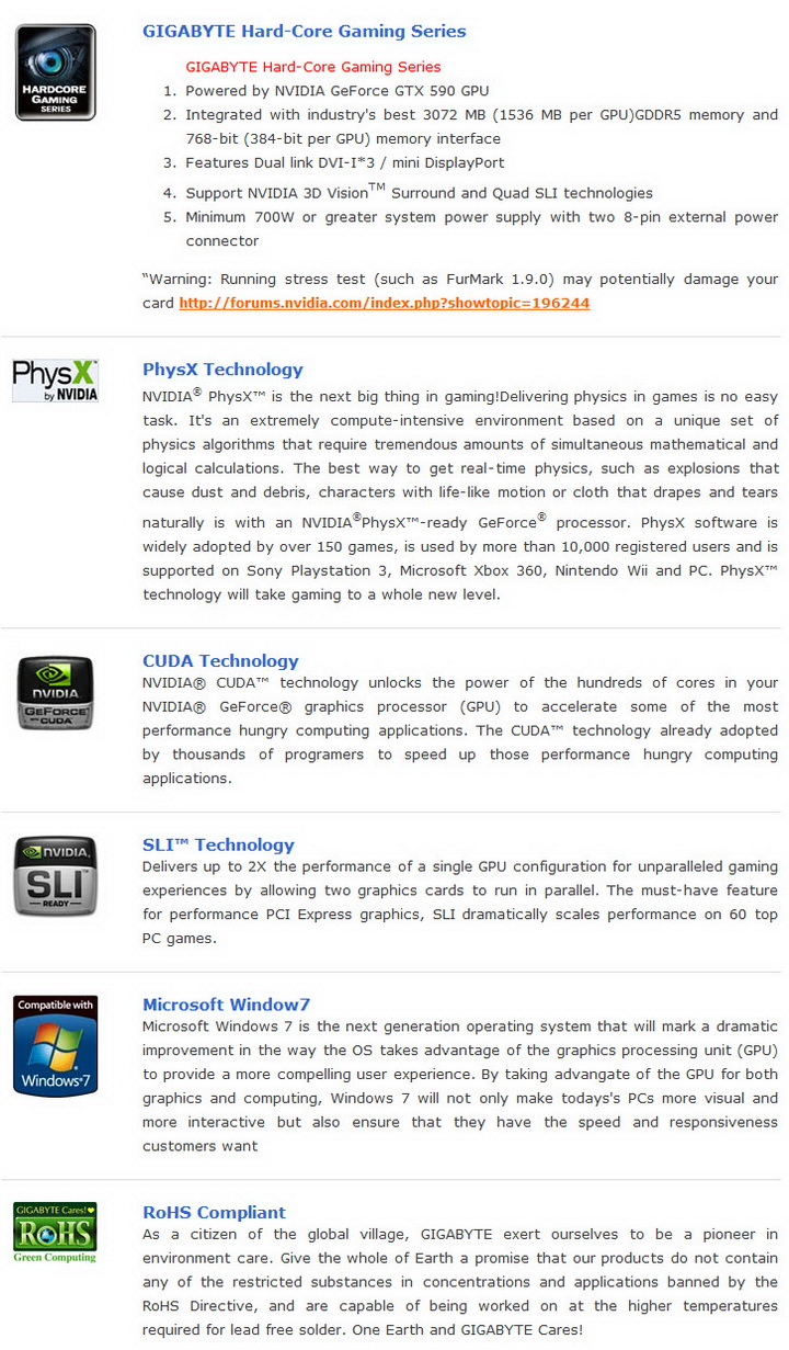 ที่นี้มาดูรายละเอียดจากตัวการ์ด GIGABYTE GV-N590D5-3GD-B ดูกันบ้างครับ หลังจากรับชมรายละเอียดการ์ด Ref กันไปแล้ว อย่างที่ทราบๆกันครับว่า ทาง Gigabyte ผลิตการ์ดรุ่นนี้ออกมาด้วย โดยที่ใช้ชื่อรุ่นว่า GIGABYTE GV-N590D5-3GD-B ซื้อ Spec พื้นฐานจะเหมือนกับ Ref Card ทุกประการ เพียงแต่ Design ของกล่องบรรจุและของแถมมาก็จะต่างกับยี่ห้ออื่นกันไปบ้าง ลองไปดูรายละเอียดกันที่หน้าเว็บของ Gigabyte กันก่อนครับ
