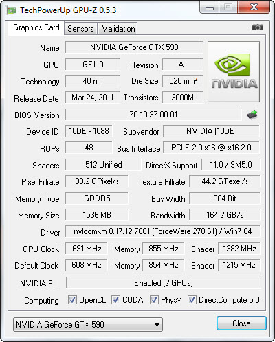 หลังจากที่ได้ทำการ Overclock Gigabyte GTX 590 ขึ้นไปแล้วนั้น ก็พบว่ามันสามารถไปได้สูงสุดที่ความเร็ว 691/1710/1382 Core/Mem/Shader ซึ่งอาจจะมองว่าไม่มากนักถ้าคาดหวังว่ามันคือ GTX 580 สองหัว แต่คงต้องเข้าใจครับว่ามันถูกบรรจุมาบน PCB เดียว ขนาดและความสามารถของภาคจ่ายไฟแม้ว่าจะ Optimize มาอย่างดี แต่ประสิทธิภาพก็คงต้องยอมรับว่ามันคงไม่ปึ๊กเท่ากับการ์ดเดี่ยวแน่นอน