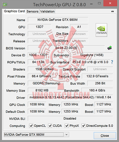และพระเอกของเรา NVIDIA GeForce GTX 980M ที่พกแรมมาเหลือเฟือ 8 กิ๊กกาไบท์ ความเร็วของ Core/Mem นั้นจะอยู่ที่ 1038/1253/1127 MHz เรียบร้อยครับสำหรับรายละเอียดของ GIGABYTE P35X V3 เรื่องกำลังไฟคงไม่ต้องสืบนะครับ…