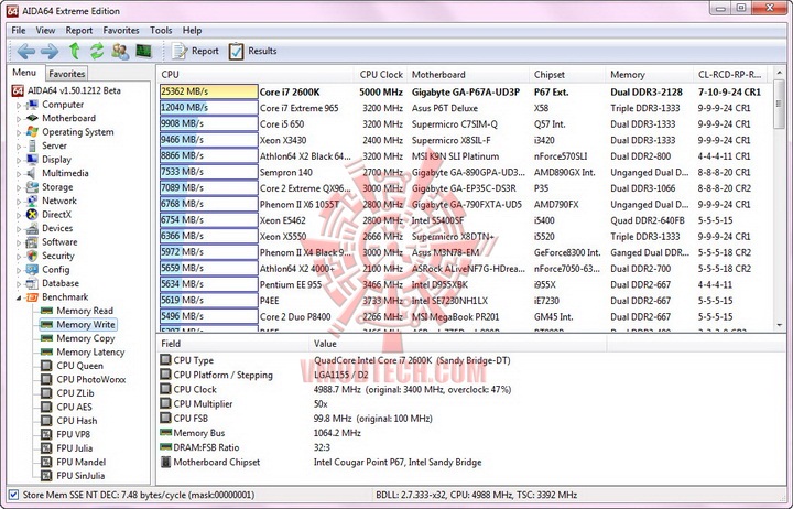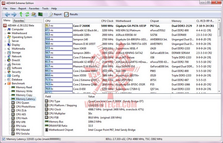 เรียบร้อยครับสำหรับผลงานของ Gigabyte P67A UD3P Motherboard จากตระกูล P67 ค่าย Gigabyte จับคู่กับ Intel Core i7 2600K Sandy Bridge ที่สามารถลากไปได้สุดๆที่ BCLK 100 x 50 รวม 4,988 MHz โดยสามารถผ่าน SuperPI 32M Multithread ก็สามารถการันตีความเสถียรในการใช้งานในชีวิตประจำวันได้อย่างสบายๆ คือถ้าเกินกว่านี้แล้วเนี่ย อาการบู๊ตได้บ้างไม่ได้บ้างจะเริ่มเกิดครับ ผมเลยตัดสินใจเอาค่าที่สามารถเอามาใช้งานได้อย่างสบายๆไม่ต้องมากังวลเรื่องบู๊ตครับ