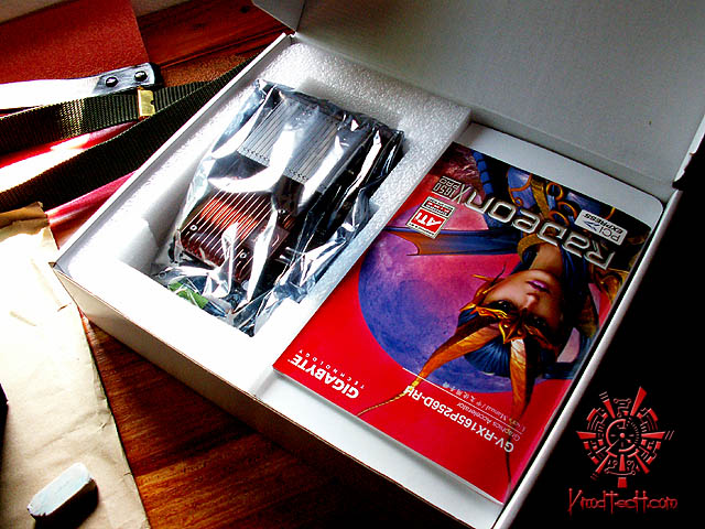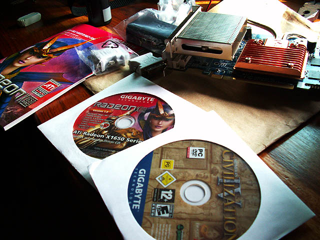 สำหรับอุปกรณ์ในกล่องก็มี หัวแปลง DVIx2อัน การ์ดจอ 1 ใบ คู่มือ 1 ฉบับ แผ่นซีดีไดร์เวอร์ 1 แผ่น ในแผ่นประกอบไปด้วย DirectX9c ไดร์เวอร์ ATi catalyst และ Vtune สำหรับ OC การ์ดครับ นอกจากนั้นยังมี HDTV Interface มันจะเป็นยังไงเดี้ยวค่อยไปดูกัน และสุดท้ายก็แผ่นเกม Civilization IV ของแท้แน่นอน ครับผ้ม