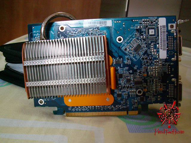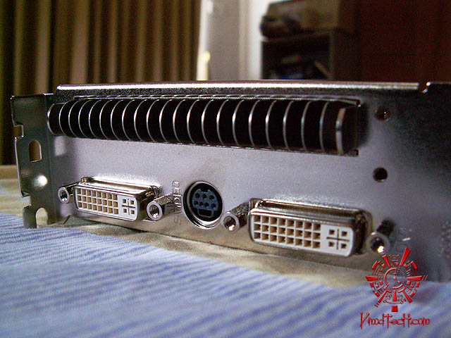 ส่วนแผงคอนเน็กเตอร์ด้านหลัง ก็เป็นไปตามมาตรฐานการ์ดสมัยใหม่ครับ Dual DVI แล้วก็มี SVIEDEO อยู่ด้วย แต่ถ้าดูไปดูมามันก็จะดูแปลกๆตาไปครับ เพราะมีฟินอะลูมิเนียมยื่นออกมาภายนอกตัวการ์ด เพื่อรับลมจากภายนอกเคสนั้นเอง ซึ่งฟินตัวนี้จะถูกเชื่อมเข้ากับฮีทไปป์ท่อแรกนั้นเอง ถ้าใครไอเดียบรรเจิดหน่อย ก็อาจจะหา Blower มาเป่าจากด้านในเคส น่าจะ work นะครับงานนี้ อิอิ