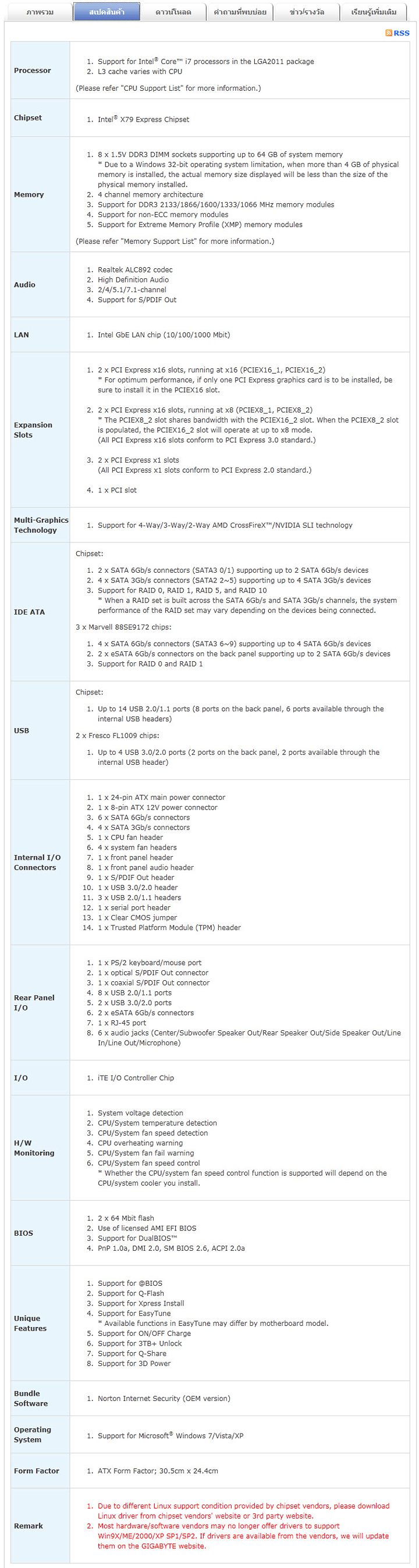 รายละเอียด GIGABYTE X79-UP4 จากหน้าเว็บของ GIGABYTE นั้นทั่วๆไปก็จะพอทราบกันดีแล้วนะครับ จะมีรายละเอียดเพิ่มเติมเฉพาะตัวก็อย่างเช่น GIGABYTE 3D Power ที่ใช้สำหรับควบคุมการทำงานของ PWM และ memory โดยเทคโนโลยีดังกล่าวได้รับการออกแบบใหม่มาสำหรับควบคุม Digital PWM controller โดยเฉพาะ, GIGABYTE Ultra Durable 5 ซึ่งได้เลือกใช้ส่วนประกอบที่มีคุณภาพสูงมาใช้ออกแบบ CPU power zone ประกอบไปด้วย IR3550 PowIRstage® ICs จาก International Rectifier, 2X Copper PCB และ high current Ferrite Core Chokes ที่สามารถให้พลังงานได้มากถึง 60A, สามารถรองรับอุณหภูมิได้มากถึง 60°C ซึ่งเย็นกว่าเมนบอร์ดรุ่นเก่าทุกรุ่น