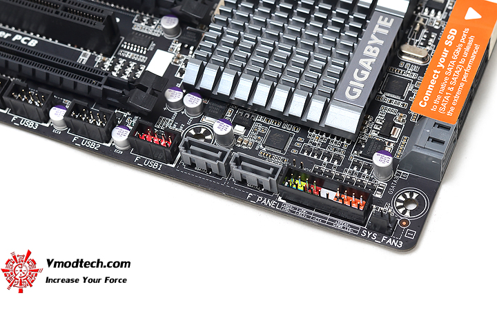 มี Heatsink ของ Chipset บริเวณด้านขวาล่างของบอร์ดเป็นจุดสนใจครับ งดงามด้วยสีเทาตัดกับพื้นบอร์ดที่เป็นสีเข็มๆ ส่วนด้านล่างของบอร์ดก็จะเห็นช่องเสียบสายไปยัง Front Panel รวมถึงช่องเสียบ SATA สองช่องครับ