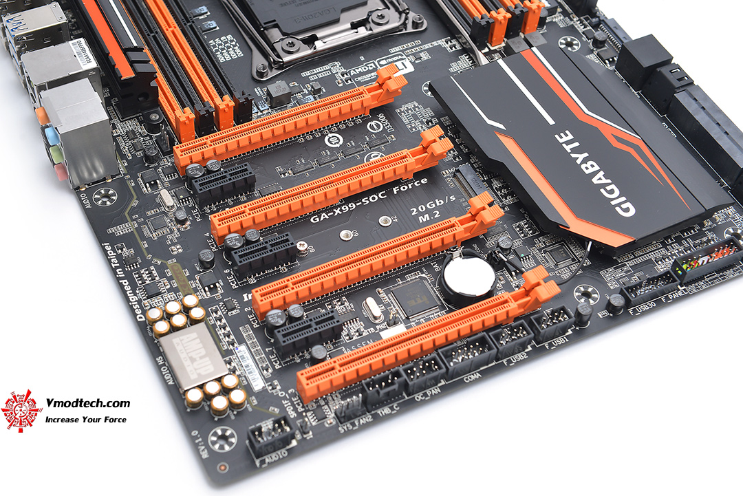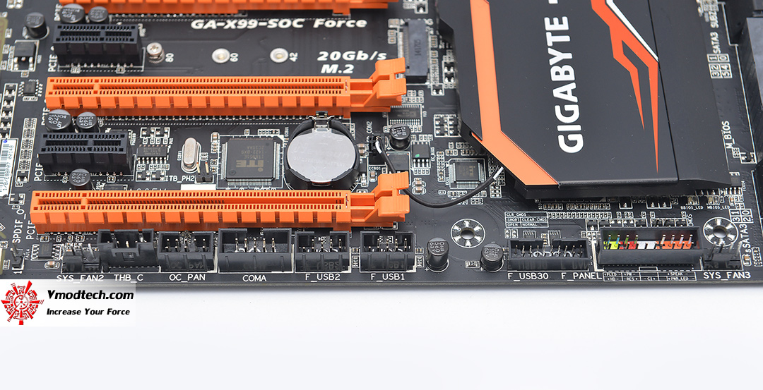 บริเวณ Socket PCI Express ครับ โดยบริเวณนี้จะมี PCI-E x16 gen3 ทั้งหมด 4 ช่อง และแบบ x1 จำนวน 3 ช่องรวมถึงสล๊อด M.2 ซึ่งติดตั้งอยู่บริเวณนี้ด้วย
