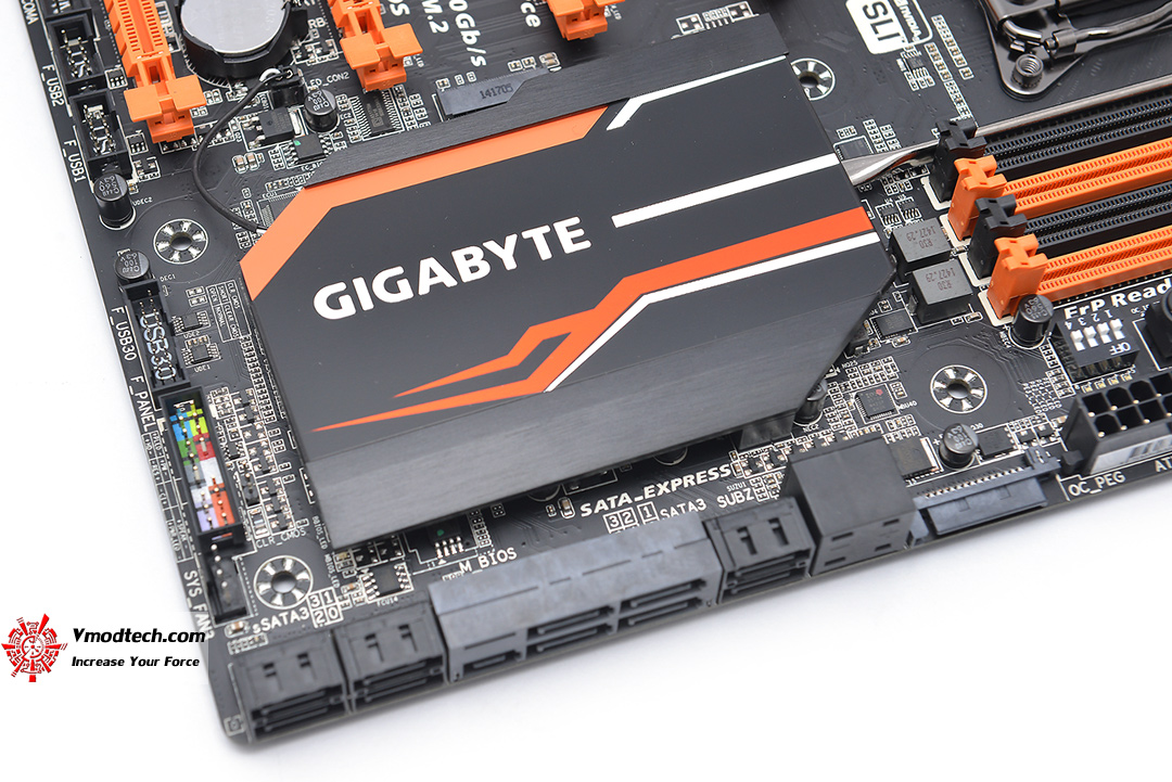 บริเวณฮีทซิ้งค์ของ PCH นั้นกิ๊กกาไบท์ออกแบบมาให้มีเทคเจอร์ไม่มากแต่หากเสียบไฟดูแล้วจะเห็นว่าแจ่มมากเพราะเค้าได้ทำการติดตั้งหลอดไฟไว้ข้างในด้วย