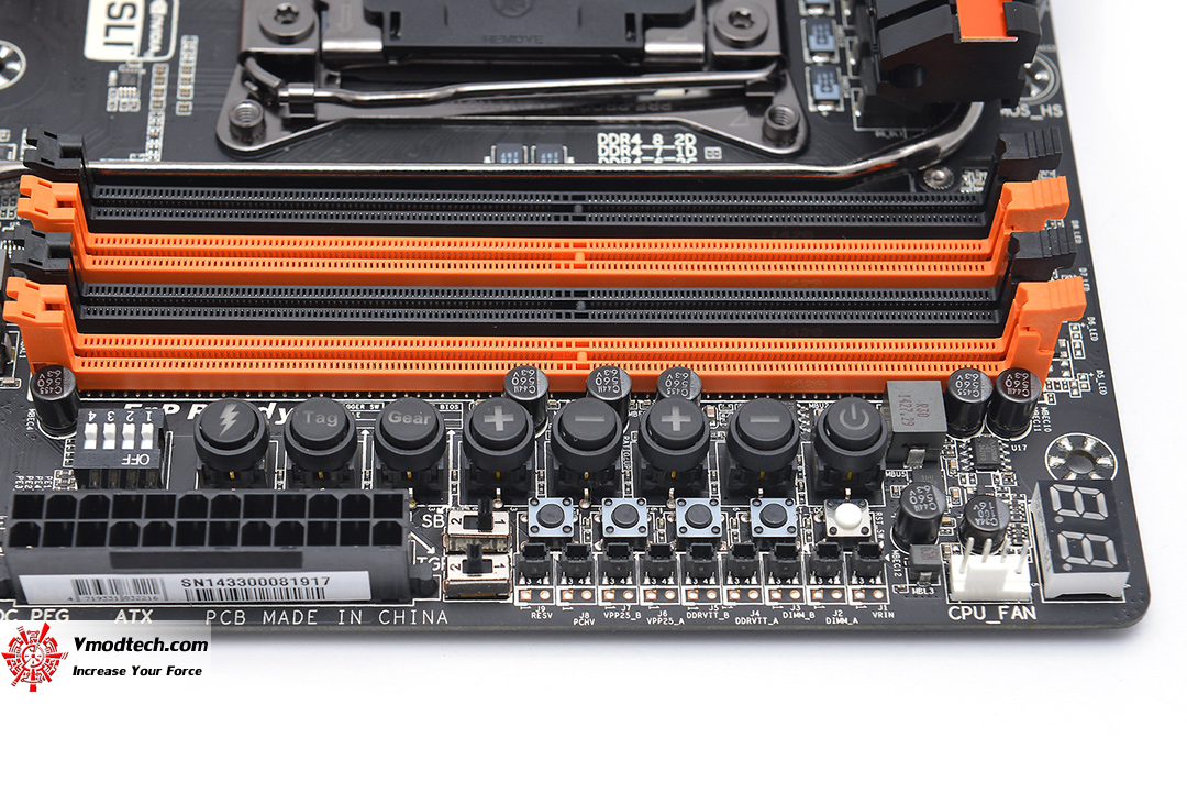 บริเวณตรงนี้สำคัญทีเดียวครับ มันเป็นจุดที่ติดตั้งบรรดาสวิทซ์ต่างในการควบคุมการโอเวอร์คล๊อกเอาไว้ โดยมันสามารถที่จะปรับ BCLK หรือสามารถปรับตัวคูณได้จากปุ่ม +/- ที่เห็นตรงกลางรูป ซ้ายมือเป็นดิพสวิทซ์สำหรับเลือกปิดช่องเสียบ PCI Express ขวาสุดก็จะเป็นไฟดีบักเพื่อแสดงสถานะการบู๊ตและจะเข้าสู่การแสดงอุณหภูมิเมื่อระบบบู๊ตเสร็จสิ้น ทางหน้าเว็บของ Gigabyte ได้กล่าวไว้ด้วยครับว่า พินส่วนที่สัมผัสกับลายวงจรของแรม และการ์ดจอนั้นได้ถูกเคลือบทองมาด้วย ทั้งนี้ก็เพื่อให้ระบบสามารถส่งสัญญาณไปมาระหว่างอุปกรณ์ได้รวดเร็วที่สุดเท่าที่จะเป็นไปได้