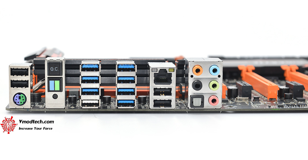 Back Panel ครับ ช่อง USB 3.0 จำนวน 7 ช่อง USB 2.0 4 ช่อง gigabit lan สองช่อง ปุ่มเคลียร์ Bios จากที่สองฝั่งซ้ายนั้นจะเป็นปุ่มปรับ OC และจะมีสวิทซ์เคลีย BIOS (cmos) ไว้ด้วย ส่วนด้านขวานั้นจะเป็นส่วนของภาคเสียงทั้งหมด