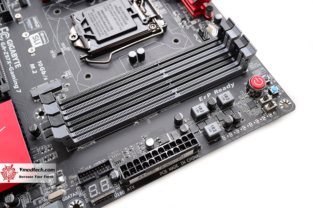 …Memory Slot แบบ Dual Channel ที่มากัน 4 Slots ได้ขนาดความจุรวมทั้งหมดสูงสุดที่ 32GB ครับ และยังมีสวิทซ์ START , RESET , Clear CMOS จุดวัดไฟเลี้ยงส่วนต่างๆบนบอร์ดและไฟบอกสถานะการบูตอยู่บริเวณนี้ด้วย ครบเครื่องเรื่อง OC กันเลย