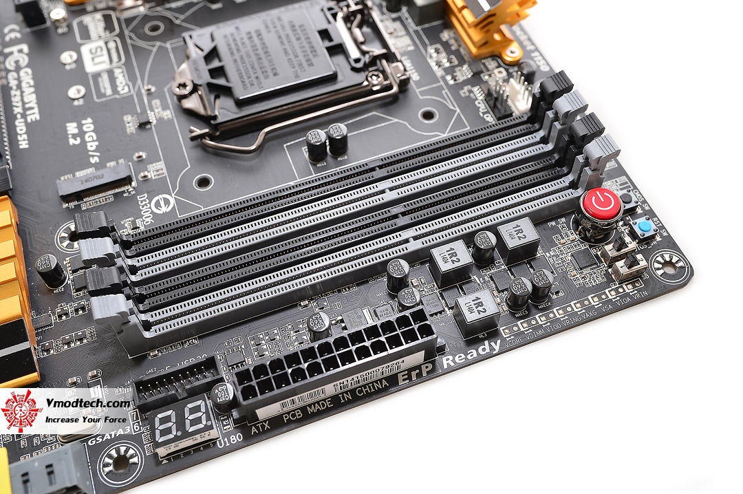 …Memory Slot แบบ Dual Channel ที่มากัน 4 Slots ได้ขนาดความจุรวมทั้งหมดสูงสุดที่ 32GB ครับ และบริเวณนี้ยังมีสวิทซ์ START , RESET , Clear CMOS และไฟบอกสถานะการบูตด้วยครับ ครบเครื่องเรื่อง OC กันเลย