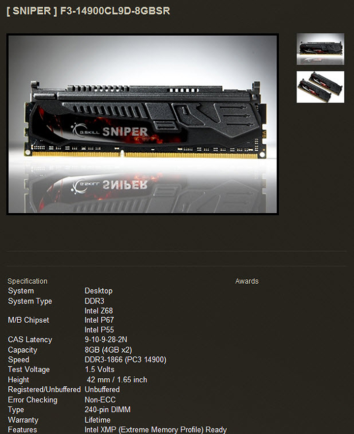 สวัสดีเช้าวันจันทร์อันอุดมสมบูรณ์ไปด้วยน้ำครับ ช่วงเสาร์อาทิตย์นี้ภาคตะวันออกก็มีฝนตกหนักพอควรเหมือนกันครับ เล่นเอาหน้าหมู่บ้านผมที่เคยท่วมบ่อยๆไม่มากนัก แต่วันนี้ท่วมหนักกันทีเดียว เห็นแล้วก็ให้นึกเอาใจช่วยพี่น้องชาวไทยที่กำลังประสพปัญหานี้อยู่ ก็ขอให้น้ำลดเร็วๆครับ สำหรับวันนี้จะมี Memory จากค่าย G.SKILL รุ่น SNIPER F3-14900 CL9D-8GBSR 4GB x 2 ครับ ความเร็วที่ระบุที่ฉลากหน้า Package นั้นไม่ทำให้รู้สึกน่าสนใจแต่ประการใดแต่ด้วยกิติศัพท์ของ Chip Ram ที่ใช้นั้นก็สร้างความน่าสนใจให้เราได้มากทีเดียวครับ มาชมรายละเอียดจากหน้าเว็บของ G.SKILL กันก่อนคับ