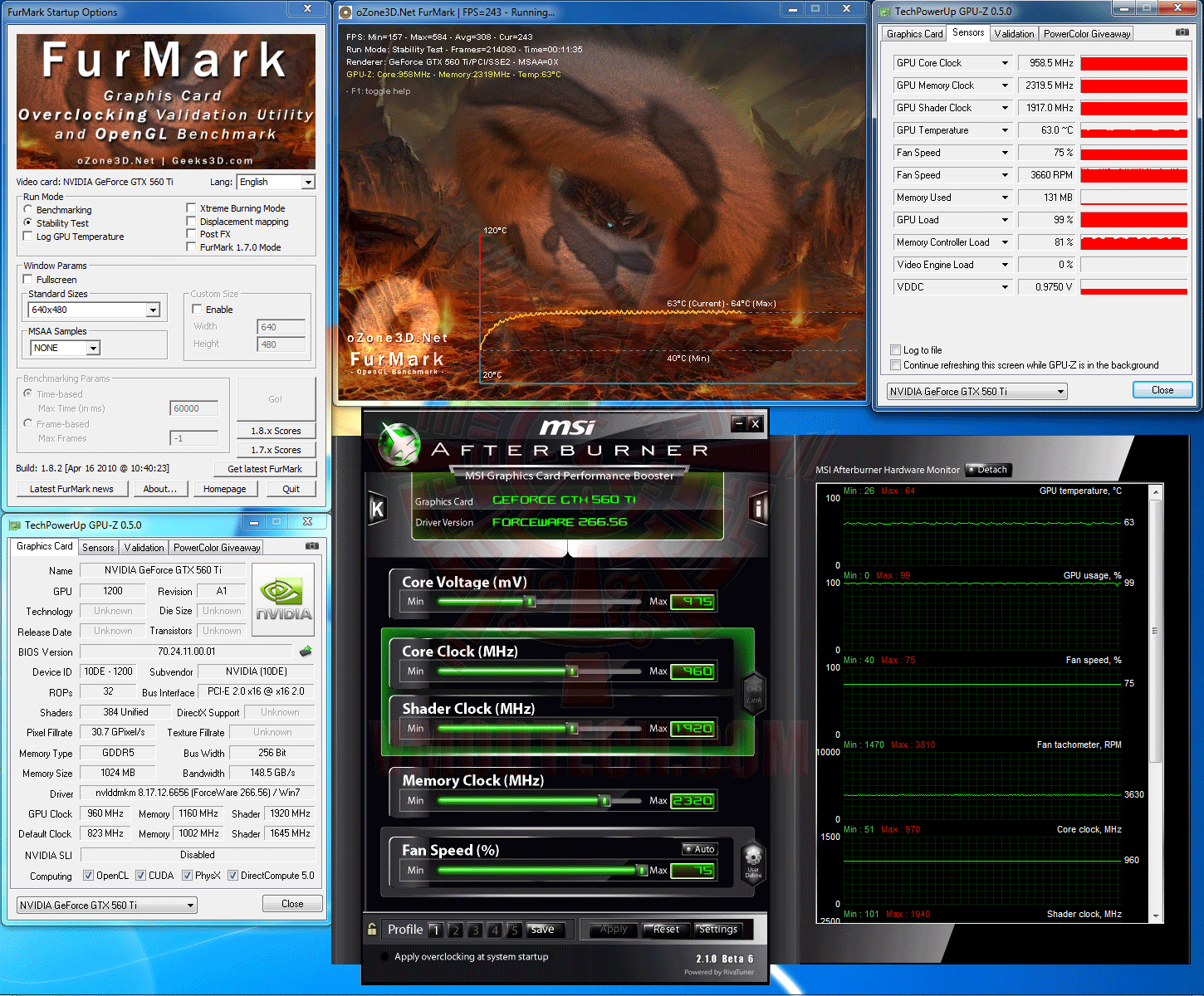 …กับรอบพัดลมที่ปรับสูงสุดได้ที่ 100% @ 5,588 rpm ใช้ไฟเลี้ยงเดิมๆที่ให้มาที่ 1,175mV และโอเวอร์คล็อคกันไปที่ 960/5,840MHz อุณหภูมิสูงสุดจะอยู่ที่ 59องศาเซลเซียส เพียงเท่านั้นนะครับ เย็นดีใช้ได้เลย แต่เสียงพัดลมที่ปรับรอบสุดขนาดนี้ก็ดังจนมากเกินไปพอสมควร จนเหมือนเสียงฝนตกหนักเลยครับ
