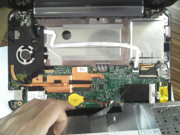 การที่จะ service ในส่วนอื่นๆ อาจต้องใช้ประสบการณ์นิดนึงในการเปิดฝาด้านล่างทั้งแผง(น็อตอยู่ใต้จุ๊กยาง) และทำการสไลด์เลื่อนคีย์บอร์ดออกมาดังรูป ภายใน ผมไม่แปลกใจเลยว่าทำไมมันถึงมีความร้อนที่ค่อนข้างสูง เพราะว่า ช่องระบายอากาศของพัดลมซีพียูนั้น อาศัยช่องว่างระหว่างปุ่มคีย์บอร์ดในการดูดลมเย็นเข้ามา และปล่อยออกในช่องระบายอากาศด้านข้างเครือ่งเท่านั้นเองครับ ไม่มีรูระบายอากาศด้านล่างเครื่องแต่อย่างใด