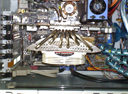 สังเกตุกันไหมครับว่าซิงค์ตัวนี้ + พัดลมมันจะกินเนื้อที่ไปกี่สล๊อต ผมบอกได้เลยครับตรงนี้ว่ามันกินเนื้อที่อย่างน้อยสุด 4 สล๊อต จากซิงค์เดิมกินแค่ 2 สล๊อตเท่านั้น ท่านใดมีการ์ด PCI เสียบอยู่เกินกว่า 1 การ์ดแล้วล่ะก็ หมดสิทธิ์แน่นอนครับ แต่อย่างไรก็ตามมันมีวิธีประกอบซิงค์อีกวิธีนึงคือเอาฟินเลี้ยวไปทางด้านหลังของตัวการ์ด แต่ผมว่าวิธีนั้นมันเหมาะสำหรับ SLi System ซะมากกว่าครับ อีกอย่างคือท่านต้องคำนวณด้วยว่ามันติดซิงค์ CPU หรือเปล่าถ้าประกอบแบบเอาฟินเลี้ยวไปด้านหลังของตัวการ์ด