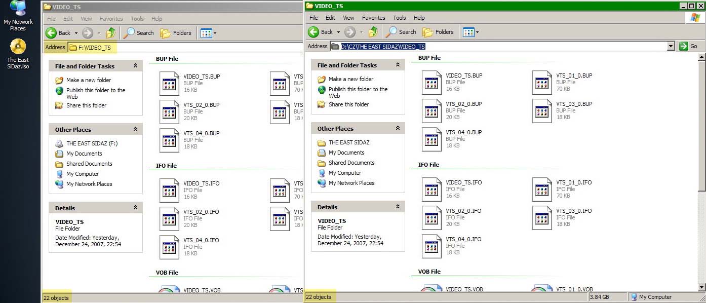เมื่อนำไปเทียบกับไฟล์ต้นแบบที่เป็น VIDEO_TS (ด้านขวาคือไฟล์ต้นฉบับอยู่ใน D:) จะเห็นว่ามีจำนวนไฟล์เท่ากันเลยครับ (ซ้ายคือไฟล์ Img ที่เรา Mount ไว้) หากใครอยากจะเช็ค MDS Check-Sum ก็ได้ครับไม่ผิดกติกา