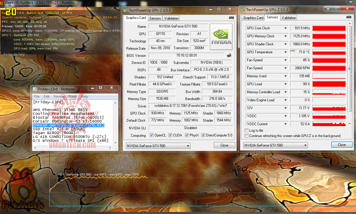 ระดับอุณหภูมิ ปั่นความร้อนให้ออกมาโดย Furmark v1.9.0 ช่วงสภาวะ Idel ในโหมด Default ของ Inno3D GTX580 ตัวนี้อุณหภูมิจะอยู่ที่ประมาณ 40c แต่หลังจากอัดไปเพียง 5 นาที อุณหภูมิสูงสุดในโหมด Default ตั้งพัดลมแบบ Auto อุณหภูมิสูงสุดไปจอดนิ่งอยู่ที่ 82c, ส่วนโหมด O/C กับรอบพัดลมปรับไปที่สุดขอบ 100% แต่ทำงานจริงอยู่ที่ 85% อุณหภูมิเริ่มต้นช่วง Idel อยู่ที่ 43c และอุณหภูมิสูงสุดหยุดอยู่ที่ 71c จัดได้ว่าความร้อนที่เกิดจากการทำงานทั้ง 2 โหมดนี้ บน Furmark ถือได้ว่า Inno3D GTX580 ตัวนี้รับมือได้อย่างแน่นอน