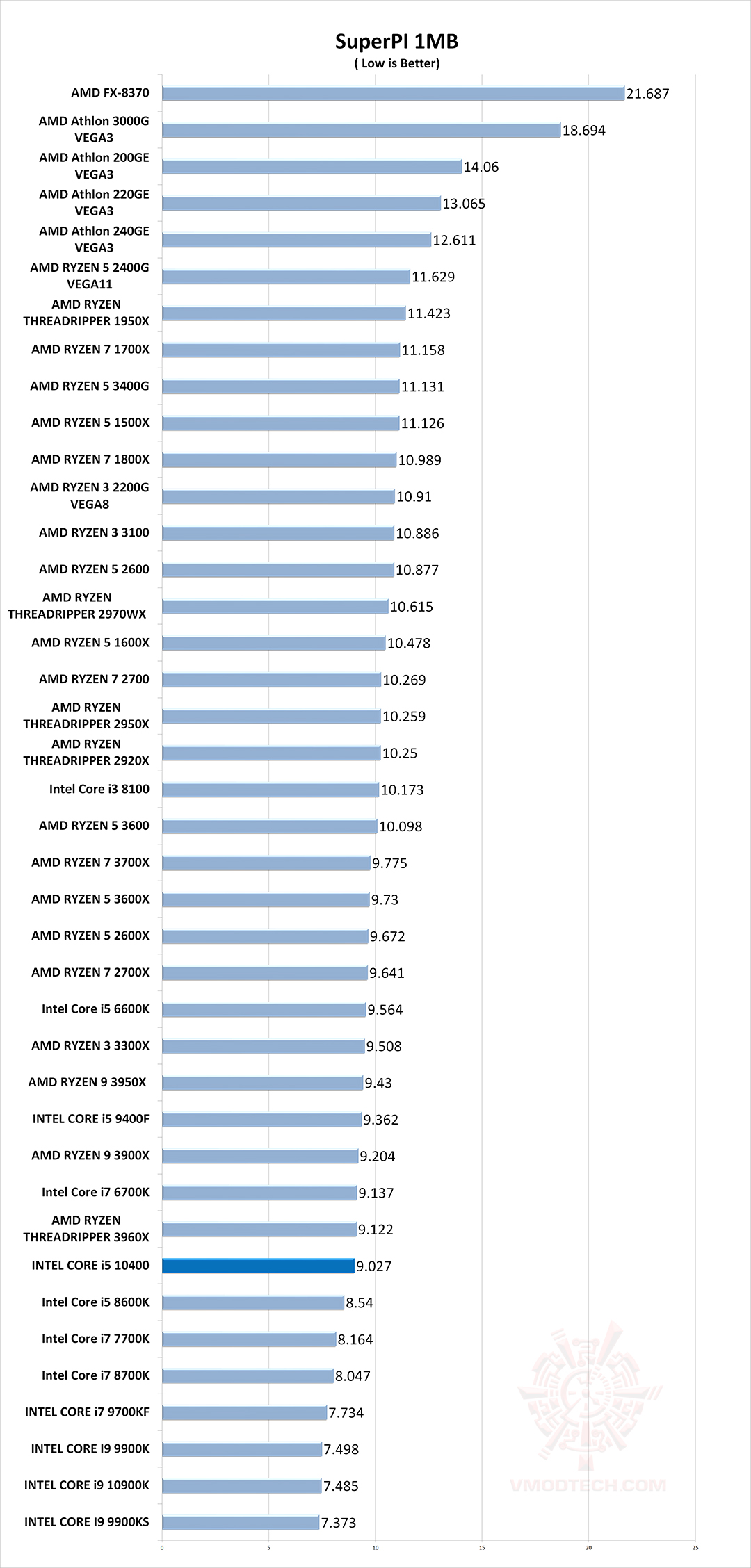 …ก็มาถึงบทสรุปครับกับการทดสอบ INTEL CORE i5 10400 ที่ถือเป็นซีพียูระดับ Mainstream ของซีรี่ย์ Intel 10th GEN รุ่นใหม่ล่าสุดในระดับกลางที่เป็นรุ่น Non K ในราคาที่ไม่สูงมากนักที่เน้นใช้งานทั่วไปรองรับความบันเทิงที่หลากหลายทั้งเกมส์มิ่ง สตรีมมิ่ง ดูหนัง ฟังเพลง หรือใช้งานด้านอื่นๆทั้งครีเอเตอร์ก็สามารถใช้งานกันได้ดีระดับหนึ่งครับ ด้วยสถาปัตย์ Comet Lake รุ่นใหม่ล่าสุดขนาด 14nm มีจำนวนคอร์ 6C/12T ความเร็วในการทำงานอยู่ที่ 2.9Ghz บูตความเร็วสูงสุดอยู่ที่ 4.3Ghz แต่จะทำงานในแบบ All Core ที่ 4.0Ghz โดยประมาณครับ แคชอยู่ที่ 12 MB Intel Smart Cache ความเร็วบัส 8 GT/s อัตราการบริโภคไฟอยู่ที่ 65W TDP ใช้แรมแบบ DDR4 บัส 2666Mhz รองรับ PCIe 3.0 และกราฟฟิกการ์ดในตัวแบบ UHD Intel 630 ครับ และรองรับการใช้งานร่วมกับเมนบอร์ด Intel 400 หรือชิบเซ็ต Z490 ซ็อกเก็ต LGA 1200 รุ่นใหม่ล่าสุดกับประสิทธิภาพการทำงานที่รอบด้านในซีพียูระดับกลาง Mid End ที่มีการประมวลผล Muti-Task ที่มีประสิทธิภาพด้วยจำนวนคอร์ 6C/12T พร้อม Hyper-Threading ที่เพิ่มเข้ามาจากเดิมซึ่งในรุ่นก่อนหน้านั้น Core i5 นั้นจะไม่มี Hyper-Threading นั่นเองครับก้ถือได้ว่า Intel นั้นได้เพิ่มประสิทธิภาพความแรงในจุดนี้เข้ามาให้ใช้งานกันแบบคุ้มๆเลยทีเดียวสำหรับซีพียู INTEL CORE i5 10400 ที่เป็นรุ่น Non K แบบนี้