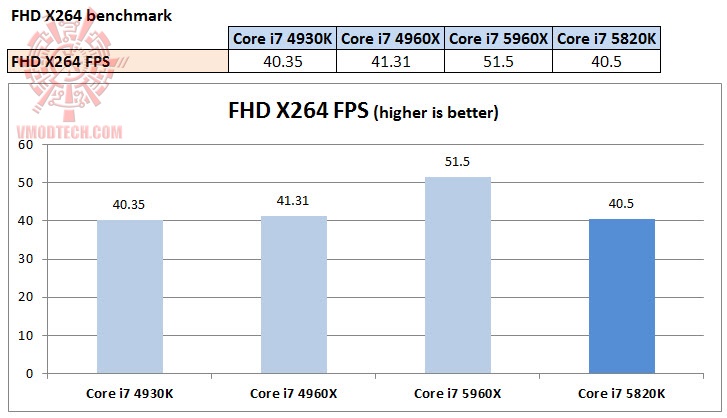 สำหรับการทดสอบ X264 นี้ถ้าไม่ผ่านก็เลิกคุยครับ ผลคะแนนที่ได้นั้นแสดงให้เห็นถึงประสิทธิภาพของ i7 5960X ได้เป็นอย่างดีเลย แรงระดับ 51 fps ครับ