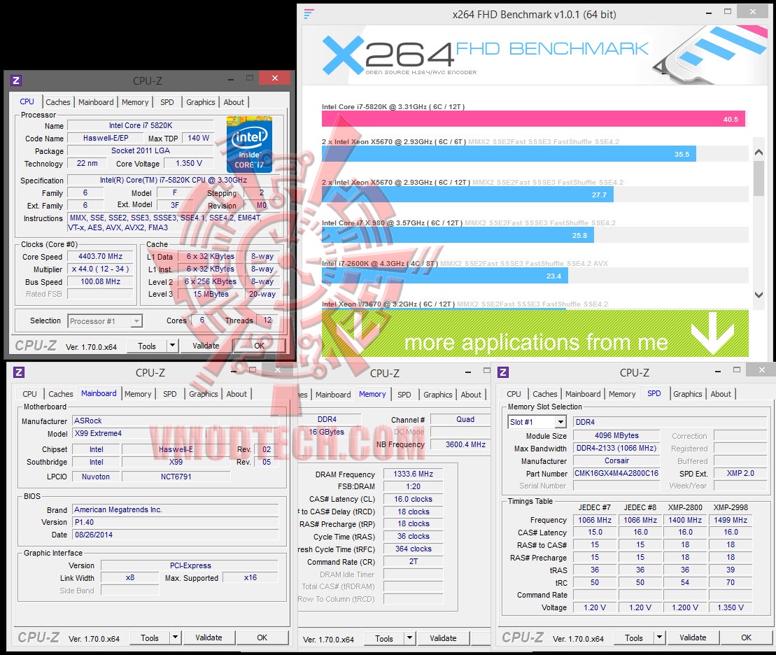 หน้าสุดท้ายสำหรับบททดสอบประสิทธิภาพของ Intel Core i7 5820K Haswell-E ที่ทำงานร่วมกับ ASROCK X99 EXTREME 4 ซี่งถือว่าเป็นเซตราคาไม่แพงนักบน platform ใหม่ 2011-3 Haswell-E ความสามารถของตัว CPU ดังที่เห็นในบทความนี้นั้นแม้ว่าจะเป็น CPU เบอร์เล็กสุดของซีรีย์ล่าสุด แต่ทว่าประสิทธิภาพนั้นไม่ได้ต่ำแต่อย่างใดครับ การโอเวอร์คล๊อกนั้นถือว่าอยู่ในเกณฑ์มาตรฐานคือ 4.4-4.5 GHz จากการปรับแต่งคอนฟิกดีที่สุดเท่าที่จะทำได้ และชุดนี้นั้นจะมีความเสถียรสูงสุดที่ค่านี้และผ่าน X264 รวมถึง HyperPI ครับ ถ้าไม่ผ่านสองตัวนี้ก็ไม่ต้องโม้เลย