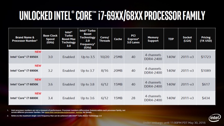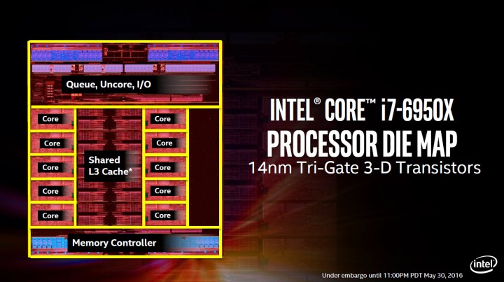 CPU ซีรีย์ไฮเอ็นด์ของ Intel Broadwell-E นั้นจะประกอบไปด้วย CPU ที่มี core 6, 8 และ 10 คอร์ ตัวแรกที่จะทำการเปิดตัวนั่นก็คือ Intel Core i7-6950X ซึ่งเป็น CPU ตัวท๊อปของซีรีย์ โครงสร้างนั้นจะเป็นแบบ 14 นาโนเมตร มีคอร์ทั้งหมด 10 คอร์และจะทำงานที่ 20 เธรด และ Cache L3 นั้นมหึมาถึง 25 เมกกะไบท์ ซึ่งถือว่าเป็น CPU สำหรับเดสท๊อปรุ่นแรกที่มีจำนวนคอร์มากมายขนาดนี้ ความสามารถนั้นมากมายไม่เพียงแต่จะสร้างขึ้นมาเพื่อประมวลผลเท่านั้น มันยังตอบรับการเล่นเกมส์ การเอ็นโค๊ดวีดีโอ หรือเรียลไทม์พรีวิว และแน่นอนที่สุดว่ามันก็ยังจะโอเวอร์คล๊อกได้เป็นอย่างดีด้วย