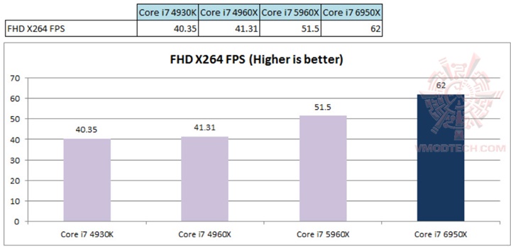 สำหรับการทดสอบ X264 นี้ถ้าไม่ผ่านก็เลิกคุยครับ ผลคะแนนที่ได้นั้นแสดงให้เห็นถึงประสิทธิภาพของ Intel Core i7 6950X ได้เป็นอย่างดีเลย แรงระดับ 62 fps ทิ้งรุ่นพี่กันเป็นทุ่ง