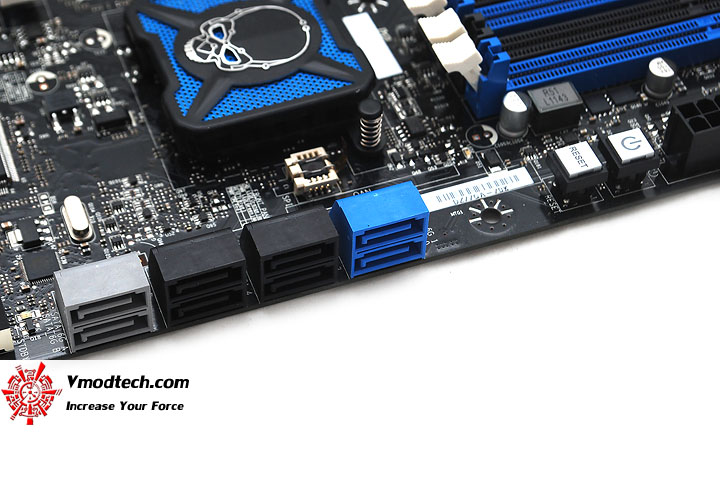 SATA Port บนบอร์ดนั้นก็จะมี SATA 6 Gb/s สี่ช่องครับ สีฟ้า (Z77 chipset) และสีเทาอีกสอง ส่วนสีดำที่เห็นจะเห็น SATA 3Gb/s