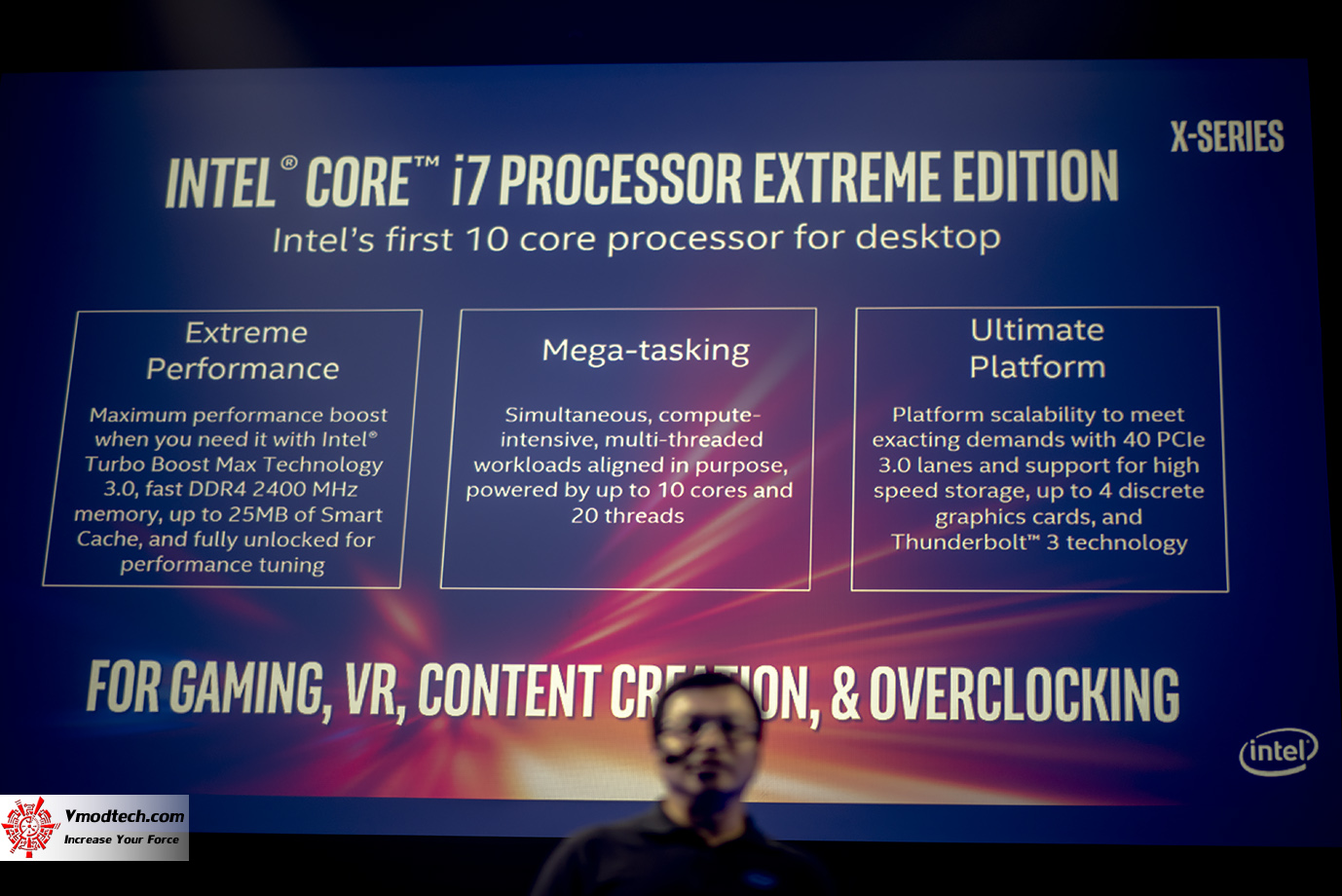 โปรเซสเซอร์ Intel® Core™ i7 processor Extreme Edition ถูกออกแบบมาเพื่อรองรับการทำงานที่หนักหน่วงของเหล่าเกมเมอร์และนักสร้างสรรค์คอนเทนท์โดยเฉพาะ ซึ่งเป็นหน่วยประมวลผลที่มีคอร์มากถึง 10 คอร์ และเธรดได้มากถึง 20 เธรด และยังรองรับการเชื่อมต่ออุปกรณ์เสริมเช่น การ์ดจอ และหน่วยความจำแบบ SSDs ได้มากถึง 40 PCIe lanes พร้อมด้วยเทคโนโลยี Intel Turbo Boost Max Technology 3.0
