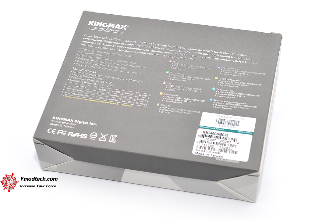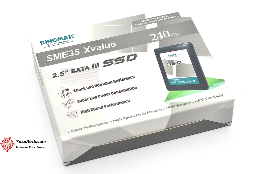 กล่องของ KINGMAX SME35 Xvalue 240GB นั้นเรียบง่ายมาก มันเป็น SSD ขนาด 2.5 นิ้ว คุณสมบัติเด่นๆก็คือ มันป้องกันแรงสั่นสะเทือน ใช้พลังงานต่ำและมีประสิทธิภาพสูง