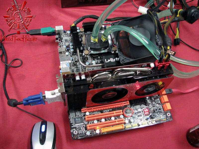 หน้าตาของระบบที่ใช้ทดสอบในครั้งนี้ครับ ด้วยระบบน้ำธรรมดาๆ ปูผ้าแดงลงยันต์กันแต๊ปมาเรียบร้อย ในบทความนี้จะพาบอร์ดและซีพียูไปทดสอบความมีสเถียรภาพของระบบบัสสูงๆ ว่าจะทำได้ซักแค่ไหนกัน