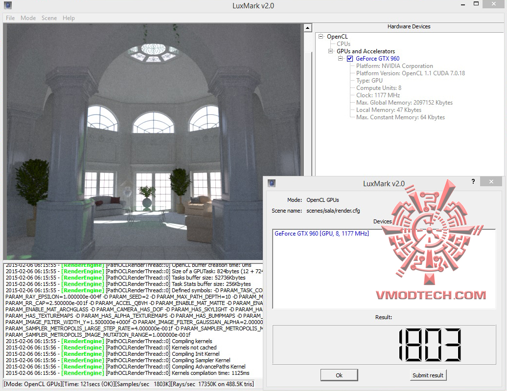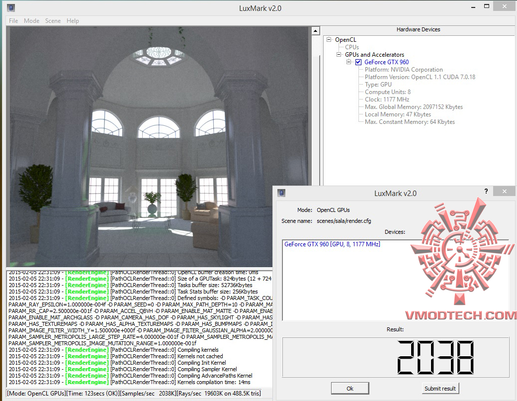 LuxMark โปรแกรมเทสด้าน Open CL ก็แรงเลยครับอยู่ที่ 2038คะแนน ดูเป็นแนวทางกันนะครับ การ์ดเขียวไม่ได้เน้น CL เท่าใดนักนะครับ