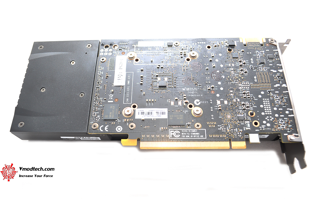 PCB ด้านหลังเป็นสีดำสนิทครับ ส่วนตัวการ์ดจะยื่นเลยไปจาก PCB คือยาวกว่า PCB นั่นเองครับ ซึ่งก็เป็นในส่วนของฮีตซิงค์ครับ ทำให้ช่องต่อไฟเลี้ยงจะอยู่ประมาณเกือบกลางตัวการ์ดนั่นเองครับ