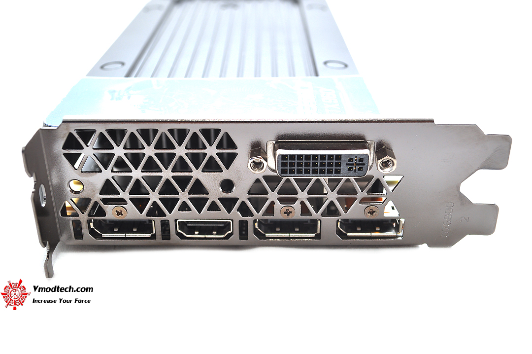 อินเจอร์เฟสด้านหลังประกอบด้วย 1x DVI-I , 1x HDMI ,3 x DisplayPort ตามลำดับ