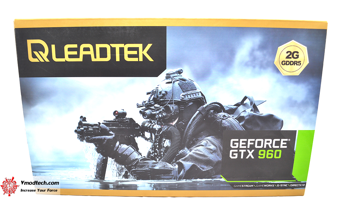 มากันในกล่องสีฟ้าสลับทองสีสดใสบอกยี่ห้อ Leadtek WinFast GTX 960 สวยงามพร้อมความแรง