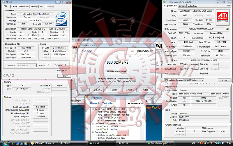 สำหรับคะแนน 3Dmark คงจะพอบอกได้ครับว่า ถึงแม้การ์ด HD3400 จะเป็นการ์ดแบบแยก แต่ก็ดูเหมือนจะให้ประโยชน์เพียงแค่ไม่ไปดึงแรมมาจากระบบเท่านั้น เพราะประสิทธิภาพของมันอาจจะดีสู้การ์ดรุ่นสูงกว่านี้ไม่ได้ แต่เรื่องของการเล่นเกม สามารถเล่นเกมส่วนใหญ่ได้โดยปกติ แต่อาจจะเปิด effect ได้ไม่มากนักนั้นเองครับ.