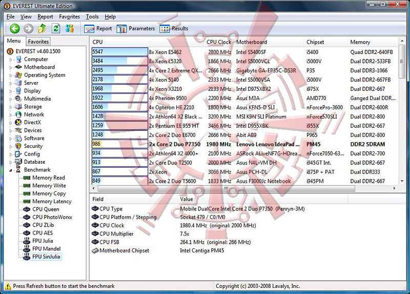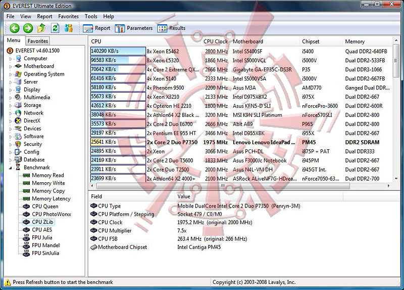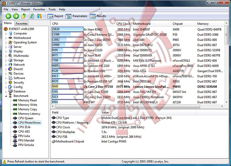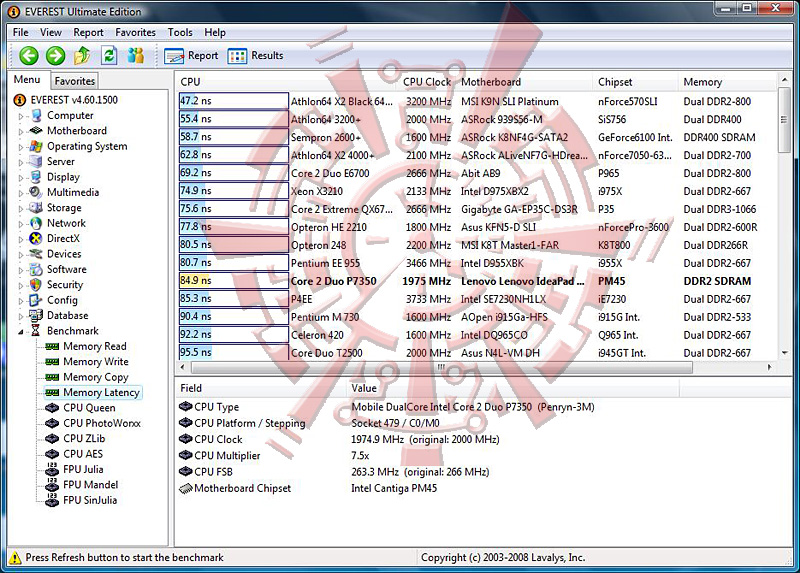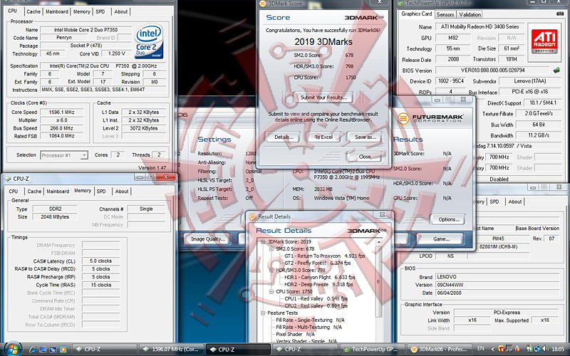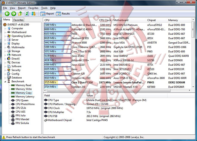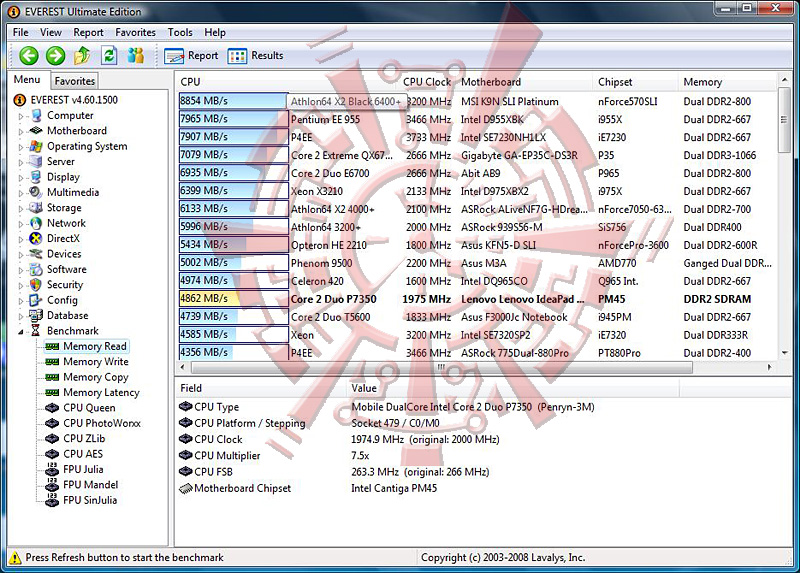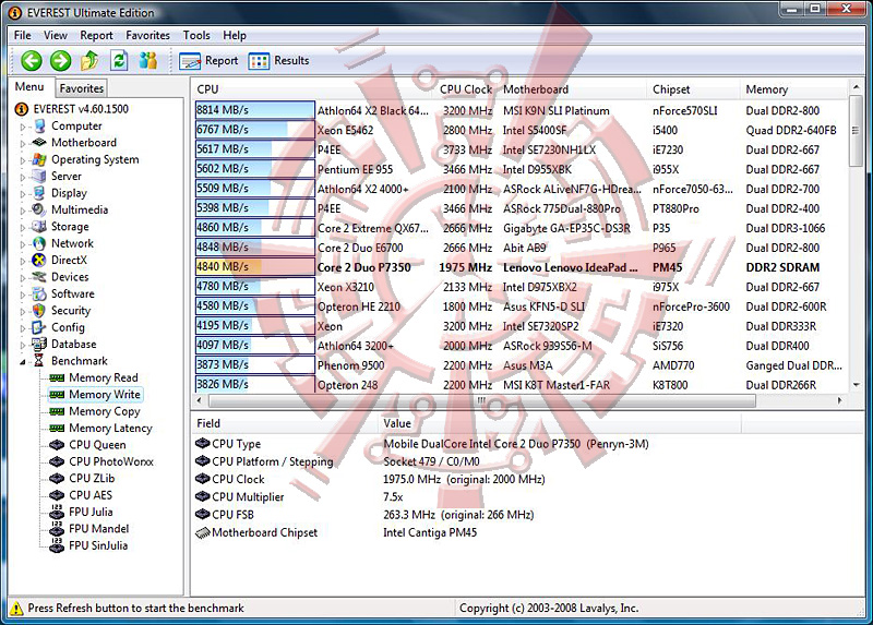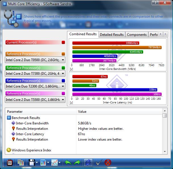Memory ทำงานที่ Single Chanel Mode จึงทำให้คะแนน Mem bandwidth ดูขี้เหร่นิดหน่อย แต่ประสิทธิภาพโดยรวมถือว่าปกติครับ สำหรับซีพียู Core 2 Duo P7350 วิ่งที่ 2Ghz เท่านั้น