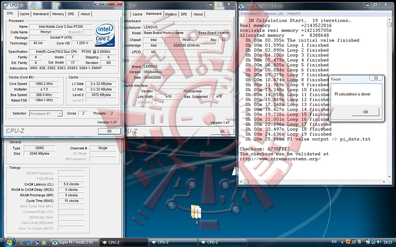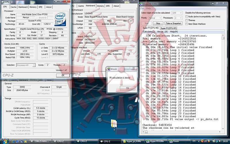 คำณวณ ค่า PI ของวงกลม ทศนิยม 1 ล้านตำแหน่ง ใช้เวลาไป 25.8 วินาที ซึ่งถือว่าไม่เลวครับ ซีพียูวิ่ง 2.0ghz เท่านั้นเองนะครับอย่าลืม อิอิ (บน) และ 32×2ล้านตำแหน่ง (ล่าง)