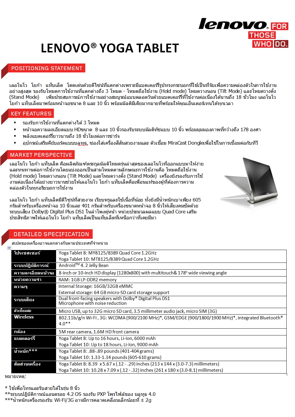 ……….เลอโนโว โยก้า แท็บเล็ตมาพร้อมหน้าจอ 2 ขนาด คือ8 และ 10 นิ้ว โดยรองรับการเชื่อมต่อแบบ MT8125 สำหรับWiFiและ MT8389 สำหรับ 3G 900/2100 MHz ของเครื่อข่ายผู้ให้บริการในประเทศไทยอาทิ AIS, DTAC และ TRUE หน่วยประมวลผลแบบ Quad Core พร้อมความจุ 16 กิ๊กกะไบท์, ระบบปฏิบัติการ Android 4.2 เติมเต็มอรรถรสความบันเทิงด้วยเทคโนโลยีระบบเสียง Dolby® พร้อมลำโพงหน้าที่ให้พลังเสียงเซอราวด์รอบทิศทางไม่ว่าจะเปิดใช้งานแบบสปีกเกอร์หรือสวมเฮดโฟน