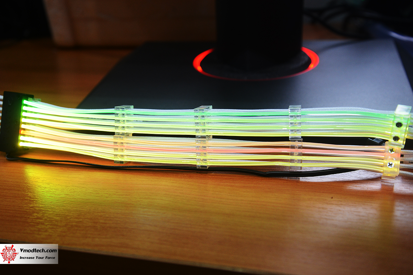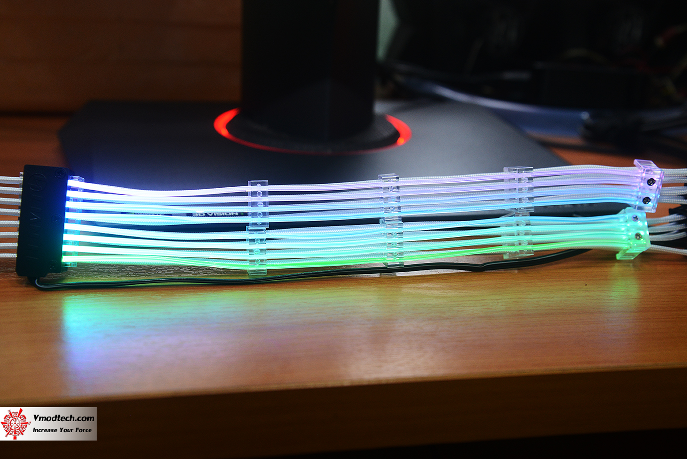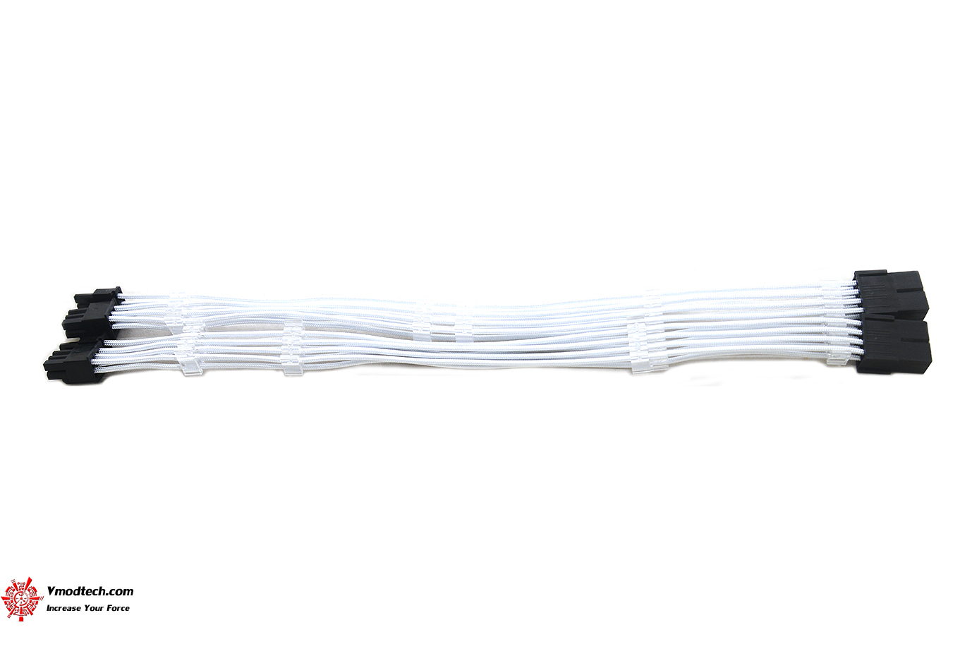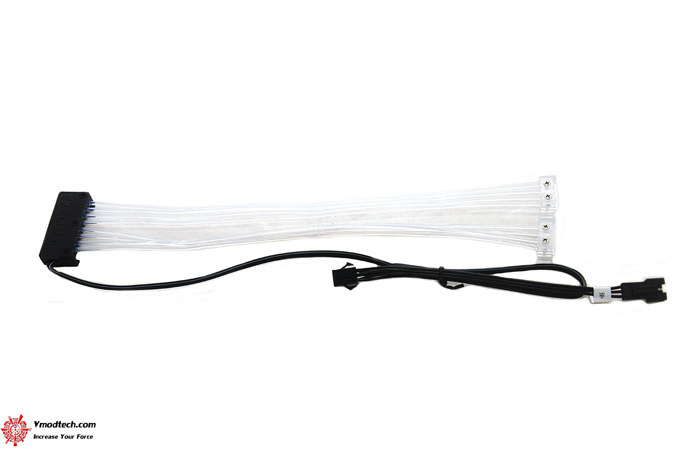 ตัวสาย 24พินเป็นสีขาวล้วนครับ ขนาด 300mm x 4.2mm x 15mm ใช้ต่อกับสาย 8พินของ PSU 8-pin(6+2) VGA และต่อเข้าเมนบอร์ดอีกรอบเพื่อโชว์ไฟ RGB นั่นเองครับ