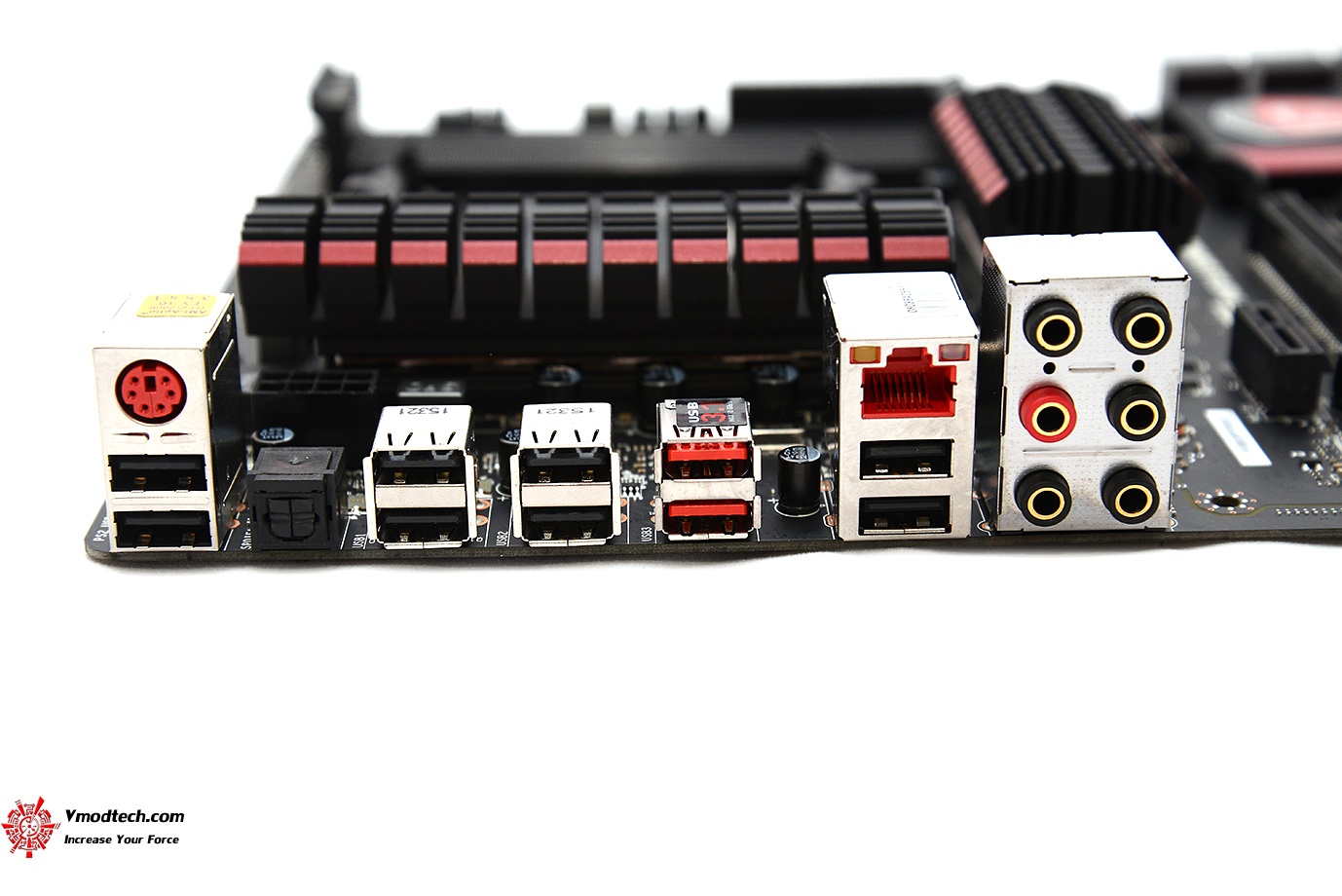 มาดูพาแนล ด้านหลังกันบ้างครับ ประกอบด้วย 1x PS/2 keyboard/ mouse combo port , 8x USB 2.0 ports , 2x USB 3.1 ports , 1x Optical S/PDIF-Out connector , 1x LAN (RJ45) port , 6x OFC audio jacks