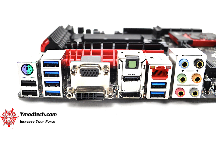 พาแนลด้านหลังประกอบด้วย - 1 x PS/2 keyboard/ mouse combo port - 2 x USB 2.0 ports - 6 x USB 3.0 ports - 1 x VGA port - 1 x DVI-D port - 1 x HDMI port - 1 x DisplayPor - 1 x Optical S/PDIF-Out connector - 1 x LAN (RJ45) port - 6 x audio jacks ให้มาเยอะเลยทีเดียว ต่อ3จอขึ้นไปสบายเลยครับ