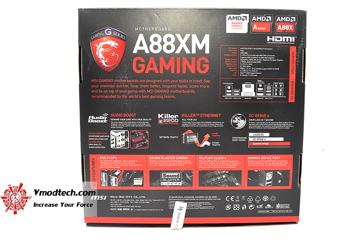 สวัสดีทุกท่านที่เยี่ยมชมเว็บไซต์ Vmodtech.com ในวันนี้เรามาชมรีวิวเมนบอร์ดของทาง AMD FM2+ ซึ่งเป็นเมนบอร์ดตัวที่ 7 ในการรีวิวของเว็บไซต์ของเราซึ่งในวันนี้เรายังคงอยู่กับแบรนด์ยี่ห้อดังอีกหนึ่งยี่ห้อนั่นก็คือ MSI ครับ โดยวันนี้มาในรุ่น GAMING SERIES กันอีกเช่นเคยซึ่งเราเคยรีวิวไปแล้วครั้งหนึ่งสำหรับในรุ่น GAMING SERIES แต่ในวันนี้จะเป็นรุ่นที่เล็กลงมาครับแต่ก็ยังคงเป็น GAMING SERIES กันอยู่มากันในชื่อรุ่นเต็มๆว่า MSI A88XM GAMING ซึ่งเป็นรุ่นที่เล็กลงมาหน่อยหรือพูดง่ายๆคือเป็นรุ่น MSI A88X-G45 GAMING ที่ย่อขนาดลงมาครับแต่บรรดาฟีเจอร์การทำงานนั้นเหมือนกันแทบทุกอย่างครับผมจะต่างกันที่ขนาดของเมนบอร์ดจะเป็นขนาด M-ATX ซึ่งเล็กลงมาเล็กน้อยเพียงเท่านั้น แต่ก็ยังคงฟีเจอร์หลักๆเอาไว้ตามแบบฉบับ GAMING SERIES ของทาง MSI ไว้ อาทิ ระบบ KILLER E2200 , ระบบเสียง AUDIO BOOST, ระบบ Military Class 4: Top Quality & Stability ก็ยังคงมีอยู่ใน MSI A88XM GAMING ตามมาตรฐานเช่นเดิม โดยส่วนของไบออสมีจุดที่แตกต่างรุ่นใหญ่ก็คือจะไม่มีจุดให้เพิ่มไฟ APU ครับแต่ระบบไฟต่างๆเหมือนกับในรุ่นใหญ่ทั้งหมดมีเพียงแค่จุดเดียวเท่านั้นที่ไม่มีให้ปรับและบรรดาสล๊อตเชื่อมต่อต่างๆก็จะไม่มากเท่ากับรุ่นใหญ่เพราะข้อจำกัดของพื้นที่ของเมนบอร์ดนั่นเอง เดี๋ยวเราไปชมกันครับว่าถึงขนาดเมนบอร์ดจะเล็กลงแต่ความสามารถนั้นจะมีมากขนาดไหนรับรองว่าไม่แพ้รุ่นใหญ่อย่างแน่นอน ก่อนอื่นไปชมรายละเอียดจากทางผู้ผลิตกันก่อนครับ