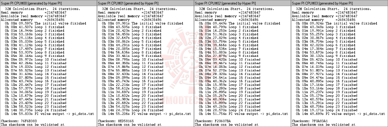 …ผ่านการทดสอบความเสถียรขั้นต่ำของเว็บไซต์เรา ด้วย SuperPI 32M 8Threads กันแบบสบายๆครับที่ความเร็วนี้ ด้วยระดับเวลาเฉลี่ยที่ประมาณ 13.17นาที ก็ถือว่าเร็วพอใช้ได้เลยครับเมื่อเทียบกับความเร็วของระบบโดยรวมที่ทำได้ ส่วน 32M 1Thread ก็ใช้เวลากันไปที่ 8.40.494นาที และสุดท้าย 1M 1Thread ก็ใช้เวลากันไป 09.574วินาทีครับ ไม่รู้อีกหน่อยเทสต์นี้จะมีมาตรฐานใหม่ เทสต์ไป 5Loops แล้วหยุดอีกหรือเปล่านะครับ อิอิกำ