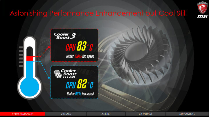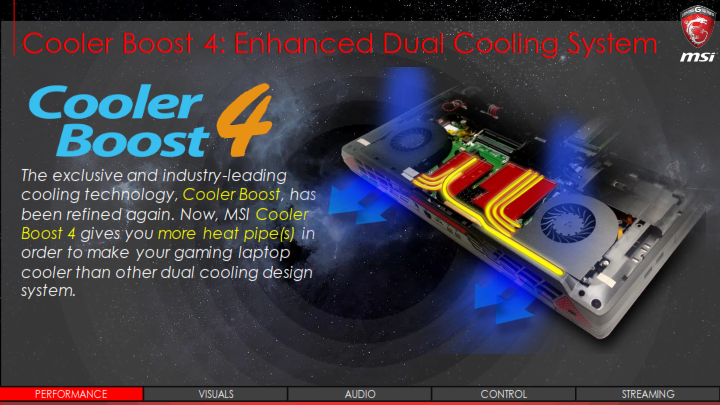 ระบบระบายความร้อนสุดเทพของ MSI ที่เป็นจุดเด่นมากๆจนแบรนด์อื่นตามไม่ทัน ก็ถูกพัฒนาให้เย็นยิ่งขึ้นแต่กลับเงียบลงด้วยรอบพัดลมที่เบากว่า แถมขนาดยังบางลงส่งผลให้ตัวโน๊ตบุ๊ครุ่นใหม่นี้บางเบาลงด้วยอีกต่างหาก สุดยอดการออกแบบจริงๆครับ