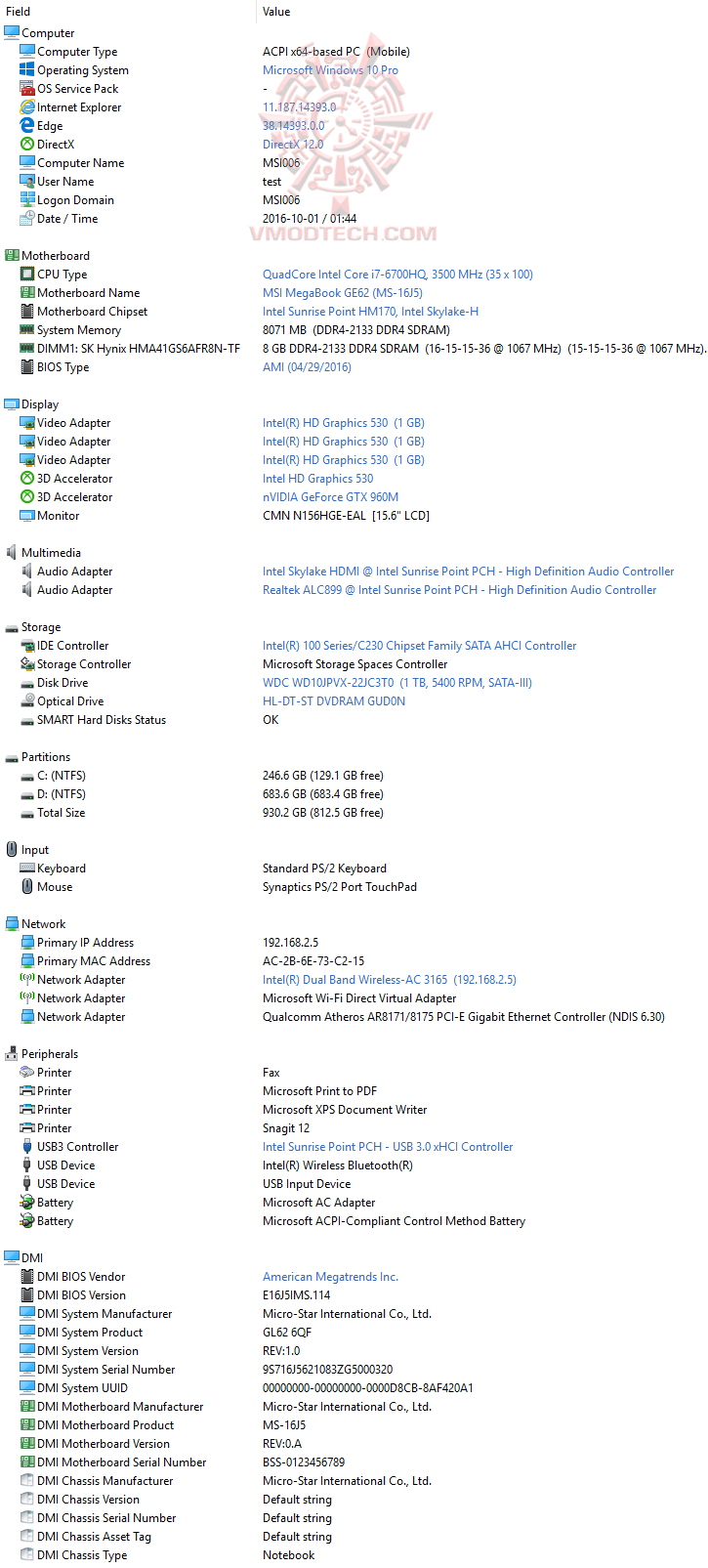 โดยรวมแล้ว MSI GL62 6QF รุ่นนี้นั้นถือว่าเป็นโน๊ตบุ๊คสำหรับใช้งานทั่วๆไปจากการติดตั้ง Intel Core i7 6700 HQ และแรม DDR4 ขนาด 8 กิ๊กกะไบท์มาให้ ซึ่งหากจะเล่นเกมส์นั้นก็พอไหวด้วย GTX 960M ซึ่งรายละเอียดโดยรวมจะมีตามรายละเอียดดังนี้