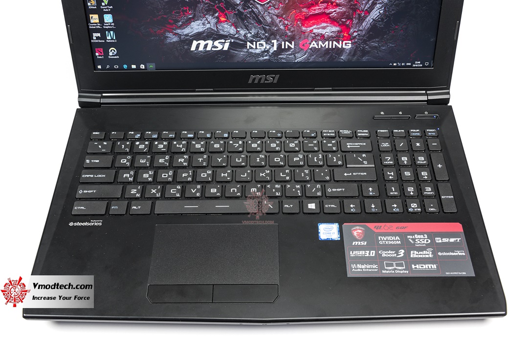 เลย์เอาท์มาตรฐานครับ ปุ่มกดเป็นแบบชิกเลทที่ออกแบบมาโดย SteelSeries ระดับความสูงของปุ่มก็สูงมาตรฐานครับ แป้นพิมพ์นั้นไม่มีแสง LED ด้านล่างนะครับ ด้านหน้าบริเวณใต้ Touch pad นั้นจะมีไฟแสงสว่างแสดงการทำงานอยู่ด้วย