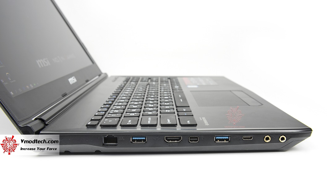 มุมมองด้านซ้ายครับ ซ้ายสุดจะเป็นช่อง GIGABIT LAN ช่อง USB 3 ช่องเสียบต่อออกจอนอกทาง MiniDisplay Port (v1.2) และ HDMI (Support 4K@30Hz), USB 3.0 สอง type ส่วนด้านหน้าสุดจะเป็นช่องเสียบไมค์และหูฟังครับ