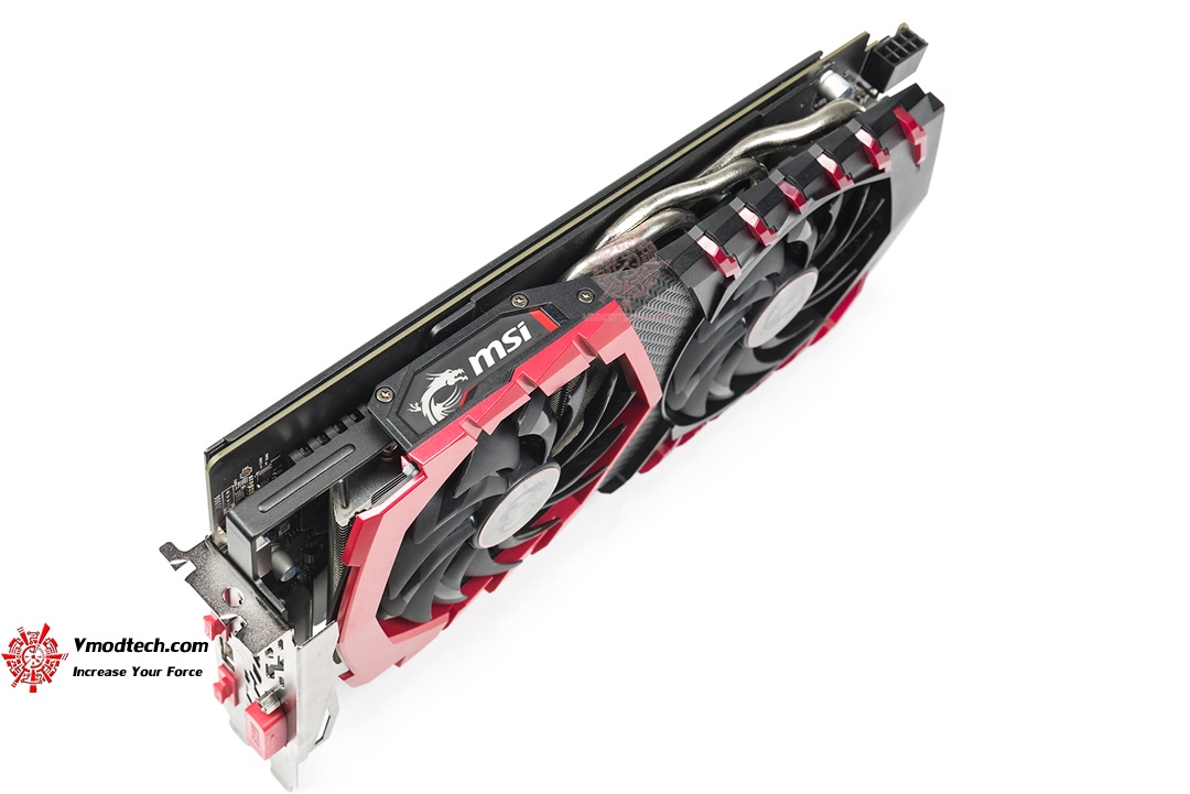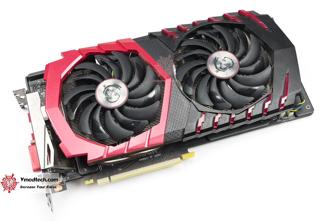 ตัวการ์ด MSI GeForce GTX 1060 GAMING X นั้นสวยงามด้วยฝาครอบชุดระบายความร้อนที่เป็นพลาสติกสีดำตัดด้วยเทกเจอร์สีแดง แลดุดันมากทีเดียว