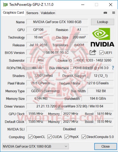 MSI GeForce GTX 1060 GAMING X from GPUZ