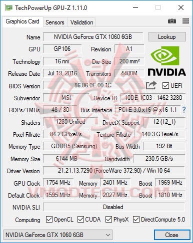 MSI GeForce GTX 1060 GAMING X OC @ 1754/2401/1969 MHz Core/Mem/Boost